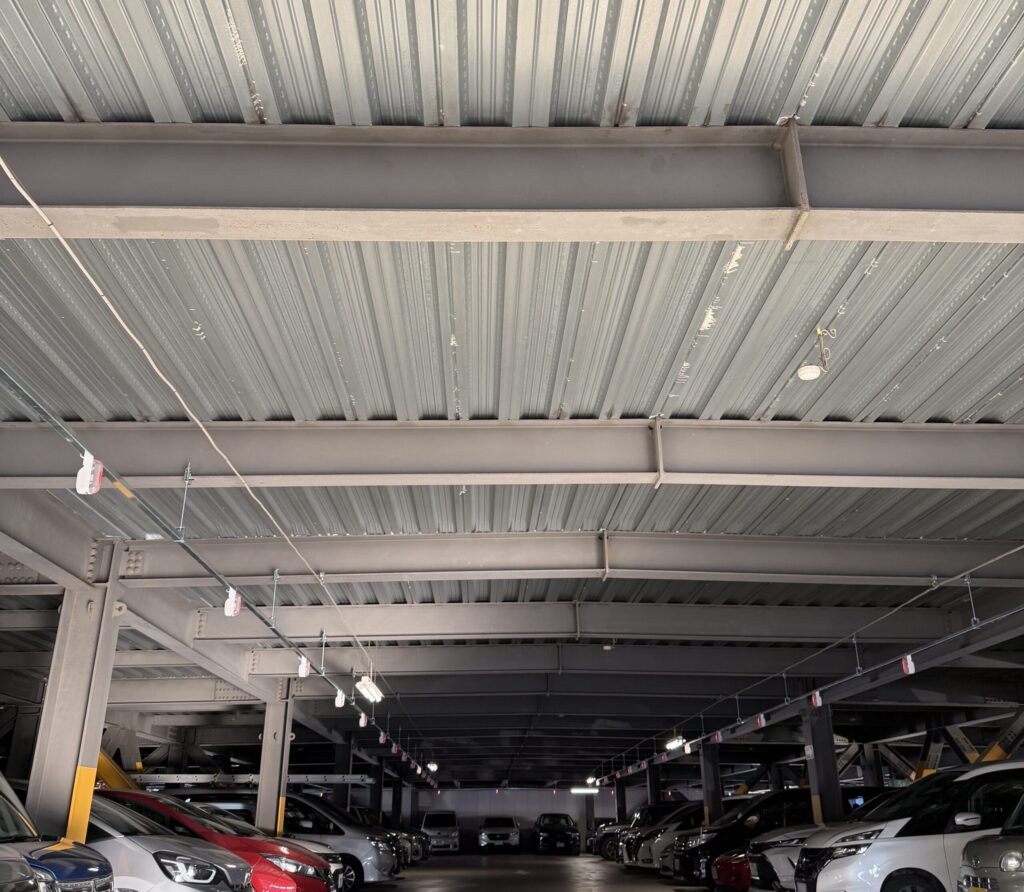 大型ショッピングモールなどにある駐車場を見上げると、剥き出しになっている薄い鉄の床板が見えると思います。